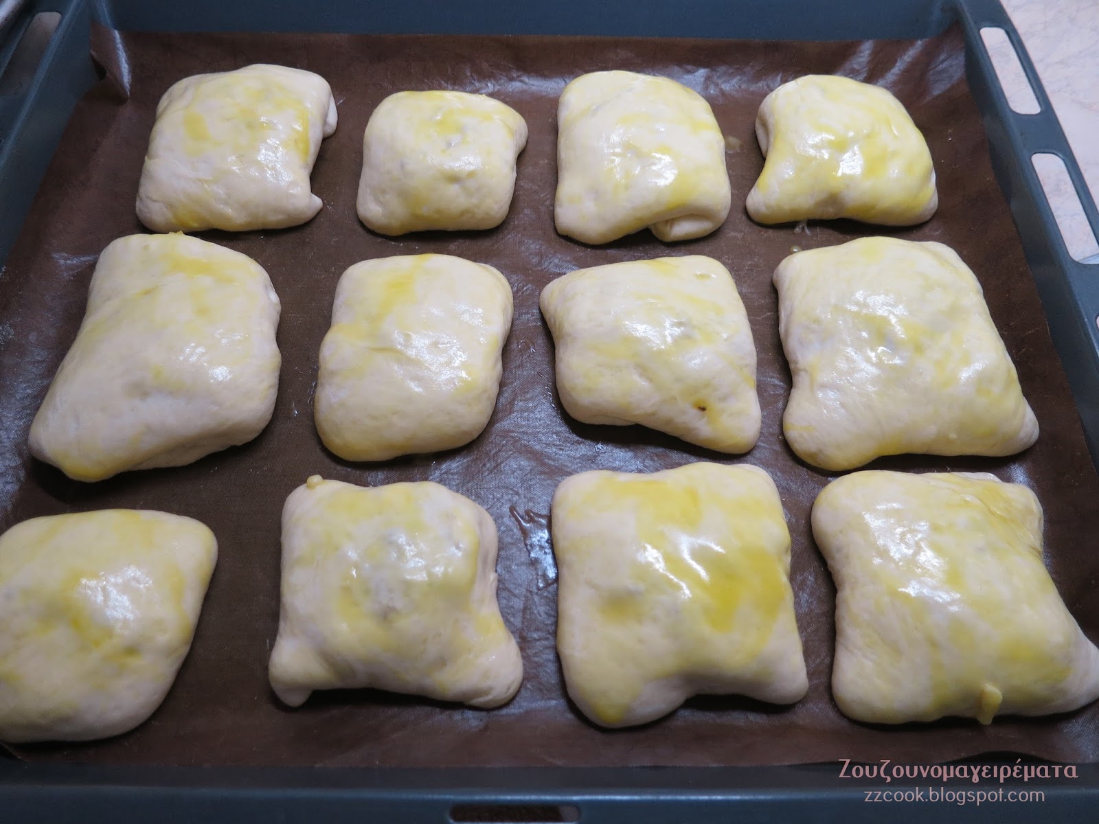 Το γυρίζουμε ανάποδα περνάμε με κρόκο αυγού πασπαλίζουμε προαιρετικά με σουσάμι, εγώ έβαλα σπασμένο και καβουρντισμένο, μπορούμε και να μην βάλουμε τίποτα μόνο το αυγό και ψήνουμε στους 180 βαθμούς μέχρι να ροδίσουν!!!